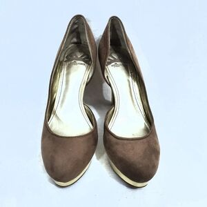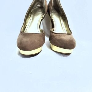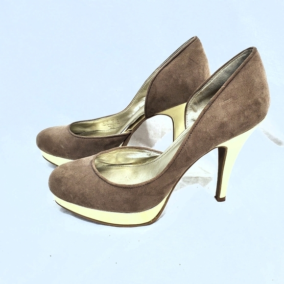Fergalicious Holler faux suede taupe and gold colored platform heels. Very good pre-owned condition. Size 9M. Platform height 1" Total heel height 4.5"