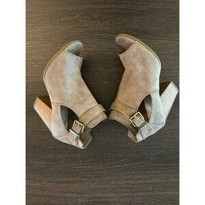 Tags-peep toe booties, ankle booties, stacked heels, tan fabric sandals, side buckle shoes, casual booties, fabric ankle boots, open toe shoes, Fergie shoes, women's size 7.5, fashionable booties, versatile footwear