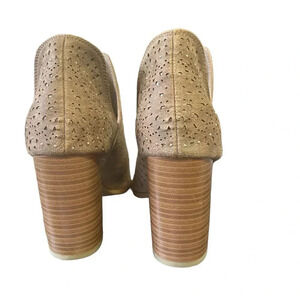 The beautiful suede has an eyelet design highlighted with metallic goldtone metal studs on the body of the bootie adds to the uniqueness of this shoe.