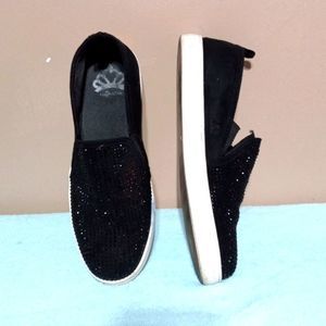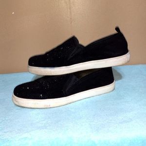 Fergalicious by Fergie black with sparkle tops tennis flats, sz 10M. The stretchy part on each side middle is cut because someone had wide feet. otherwise very good condition.