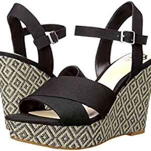 Add a chic Summery touch to your shoe collection in the Mollie Wedge by Fergie. Featuring a woven geometric accent on a towering 4” wedge heel. Adjustable ankle strap. 1” platform with cushioned footbed. Like new.