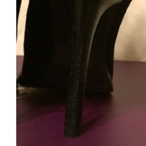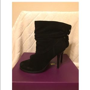 Fergie: Black Suede Ruckus Ankle Bootie, with 4โ Stiletto Heel, snaps at the back.