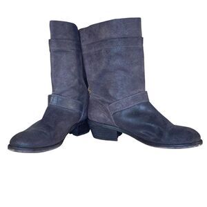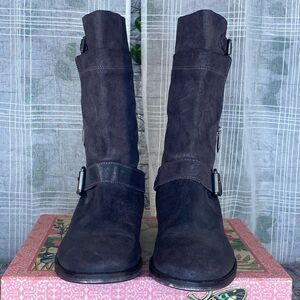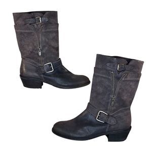 Fergie Leather Mid Calf Moto Boots Buckle Zipper Detail Women SZ 9 Square Heel