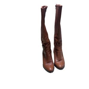 Fergie Olympia Tan Leather Studded Y2K Vtg Zip-Up Tall Heeled Boots Womens 5.5
