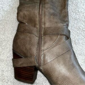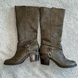 These boots feature a classic knee-high silhouette with a stacked or block heel, suggesting both style and walkability.