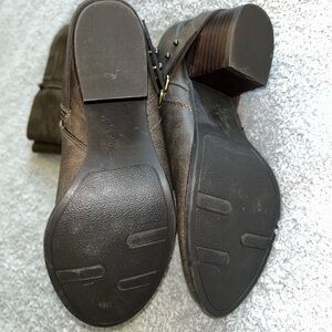 A notable design element is the decorative strap and buckle detail around the ankle/lower calf area, adding a touch of sophistication and visual interest. side zip closure for easy wear.