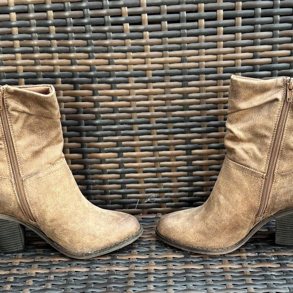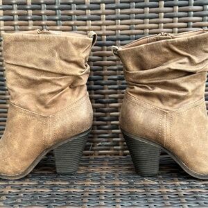 These ankle boots are size 6.5. They have never been worn. They are tan in color. I’m asking $25 for them.