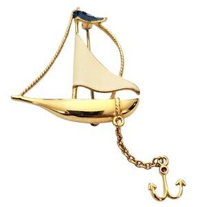 Fernando Originals Gold Tone Enamel Sail Boat Brooch Anchor Chain Dangle, L963