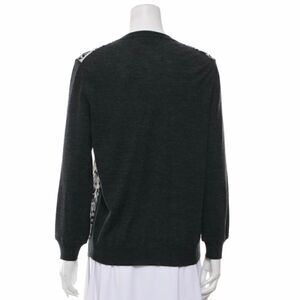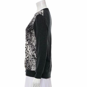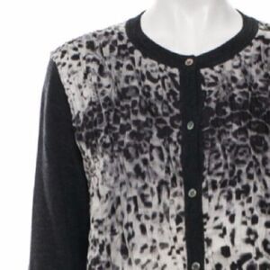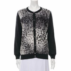 Animal print Ferragamo cardigan featuring a silk pleated animal print design with the Salvatore Ferragamo signature on the textile (see photo). Crew neckline. The neckline, cuffs, hem, and cardigan back are 100% wool.
