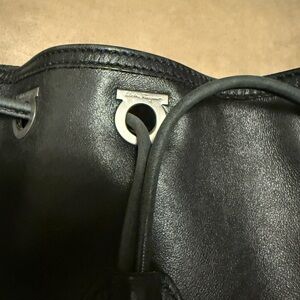 Ferragamo Black Leather Drawstring Bag with Small Pouch. Some signs of wear on exterior and the strap.