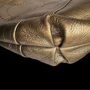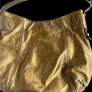 Elegant bronze gold leather shoulder bag. The color is a bronze gold. The color is not as gold as n the photos. Much classier and not in your face. The bag is in excellent condition with minor wear and no signs of damage or discoloration. Inside is clean. Features signature Ferragamo logo. Perfect for any occasion.