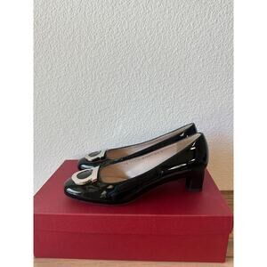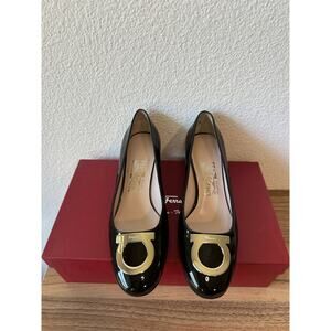 Ferragamo Distinta Black Patent Calf Pumps Gancini Logo Heels Size 6.5B w/ Box