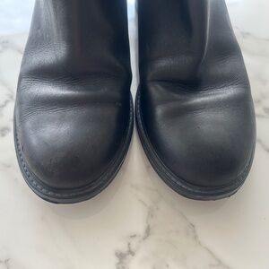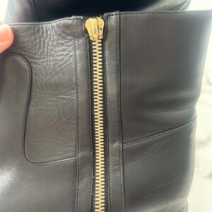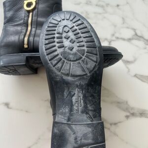 Gorgeous black calf leather Moto boots with hidden platform, lug sole, and gold metal zipper detail and gold Gancini logo pull. One pull is missing however. Other than that, they are perfect and have been hardly worn. I don't know where the other pull is :( . That said they are super easy to just step into, so you don't need to zip or unzip them at all. Going to see if I can get a replacement pull. Priced accordingly because of the pull. Perfect boots that go with everything. Fit an 8-8.5 best. Medium width.