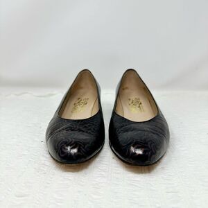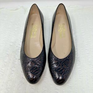 Gorgeous patterned kitten heels from Ferragamo. They have both leather uppers and soles and are in excellent condition. They are a size 7.5B.