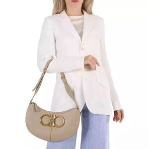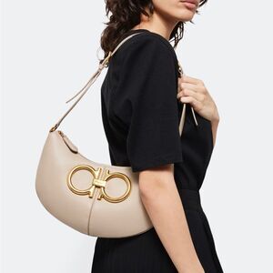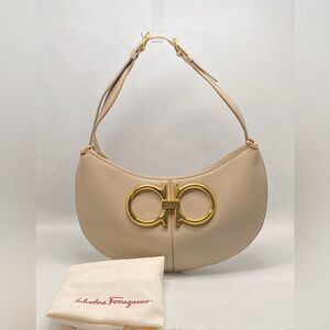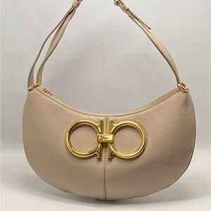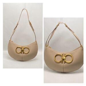 Maxi Gancio Leather Shoulder Bag In Beige Leather With Gold-Tone Hardware And Gancini Detail