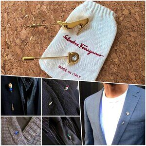 Enhance your collection with a rare Salvatore Ferragamo stick pin set, adorned with a sculptural high heel and a captivating crystal accent.These meticulously crafted gold-plated pins epitomize Ferragamo’s signature elegance, infused with a touch of playful whimsy. They are ideal for fashion enthusiasts, collectors, and individuals who cherish high-end novelty.
