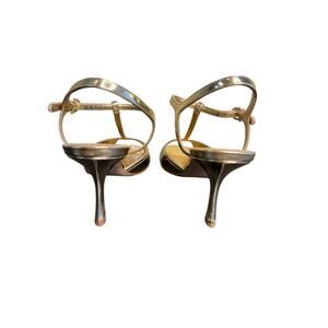 This Ferragamo sandal has a T-bar strap that wraps around the foot with a peep toe. This laminated leather shoe features a stiletto heel and fastens at the ankle via a golden Gancini buckle. The heel measures 9.5 cm.
