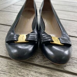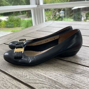 Salvatore Ferragamo Vara Bow Black Leather Low Block Heel Pumps Womens Size 7.5
