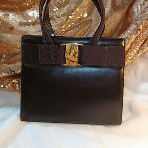 Ferragamo Vera Ribbon Brown Leather Bag. Beautiful, Good Condition. There are some cracks on the inside handles. Please review the pictures.