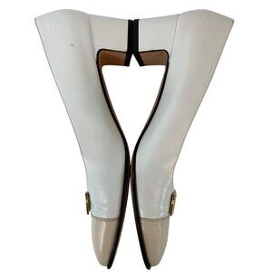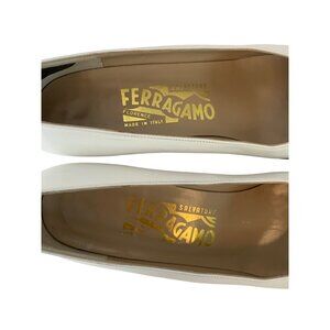 These Ferragamo heels showcase timeless sophistication with their white and beige leather design, gold logo detail, and comfortable 1.5" chunky heel. Crafted in Italy.