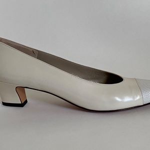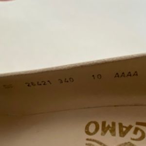 Ferragamo women's pumps are bone-colored with alligator-style design on toes. Although they list as being white, they are actually bone colored. They have a heel height of 1.78 inches. Size 10AAAA (narrow, but I wear a 9 and can fit into them although snugly). There are absolutely no visible signs of wear except on the soles, and have been exceptionally well taken care of. I don't want to part with them but I no longer wear heels.