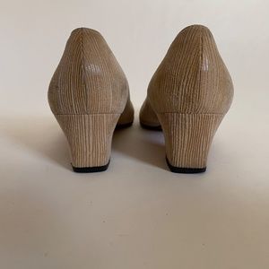 Ferragamo women's pumps in tan-colored subtle pattern. These shoes are very well taken care of and show no signs of wear except on the soles. Size is 7 1/2 B, heel height is 1.78 inches. I don't want to part with these shoes but I no longer wear heels. See my other two listings for Ferragamo shoes in the same size.