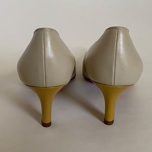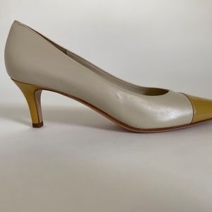 Ferragamo women's shoes in bone/gold colors. Exceptionally well taken care of, rarely worn, and show no signs of wear except on the soles. Size is 6 1/2 C, heel height is 1.78 inches.