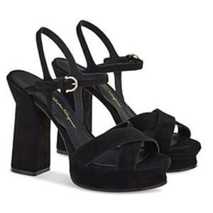 Experience the elegance of Salvatore Ferragamo with these black heels, featuring a high block heel and a raised platform for added comfort. The multiple thin straps and ankle buckle closure ensure a secure fit, while the open-toe design adds a touch of retro flair. Ferragamo Women's Sonya Suede Ankle Strap Platform Sandals Size 5.5 Ferragamo Women's Sonya Black Suede Ankle Strap Platform Sandals MSRP $995.00 Fits true to size, order your normal size Open toe Buckled ankle strap 4.13" (11.5 cm) wrapped block heel Suede or herringbone-print suede upper Leather lining and sole Made in Italy Any minor imperfections are shown in my pictures and video