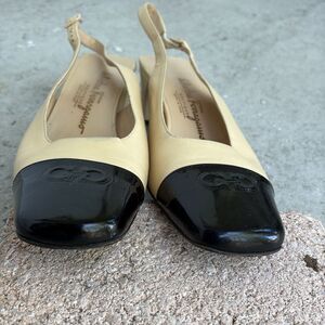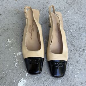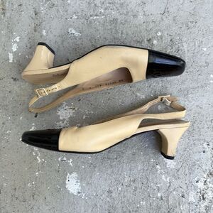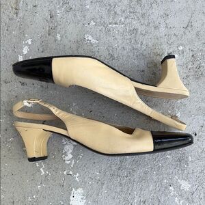Check out the pictures. These are good, but not perfect. They need a little bit of touchup here and there leather with a patent leather toe. Heel height is 2 inches. They have new heel taps put on them.