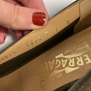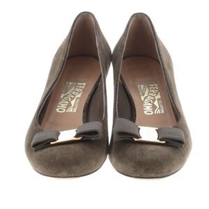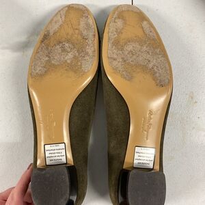 GUC Ferragamo pump style heels with a kind of block heel. I think the color is kind of a moss green with some tan too. The hardware is green. These are great for the holiday season - I would pair with a nap dress!