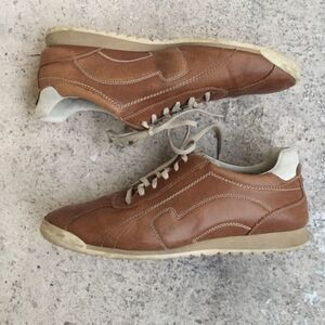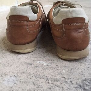 These lite brown leather sneakers are in good condition, soles are good with very little wear on the heel and on the toe, just need to be cleaned. Barely used
