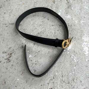 Please look at the pictures. This leather belt is in good condition, but there is very slight minor wear on the gold buckle size is 75 and measuring. The leather strap only is 32 inches long by 1 inch.