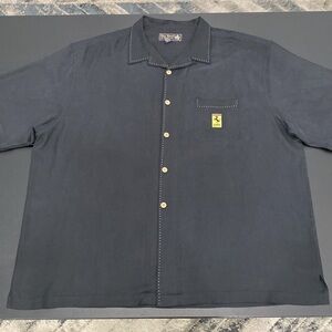 Ferrari Pebble Beach Silk Collared Button Up Dress Shirt in size 3XL. From Pebble Beach Car Week. Measurements are shown in photos. No visible signs of wear. No flaws. Beautiful contrast stitching. Very soft. Features embroidered logo on front pocket and on back. Nat Nast garment.