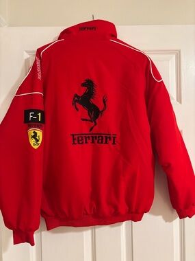 Bold re jacket with a wide black chest stripe. Features embroidered and printed racing patches and logos. Zip-front closure and cuffed hem. Sporty collar for a race-inspired look. Size medium. Brand is Jackets 4 Racing. Never worn since Sainz moved teams :(