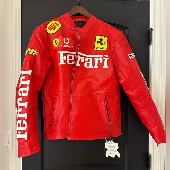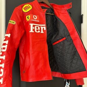 Bold red jacket with Ferrari logos. Perfect for racing fans. Stylish and comfortable design. Purchased in Europe. Very well made. Never worn needs broken in. Gorgeous Italian ๐ฎ๐น f1