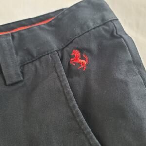 Flat front, with Ferrari prancing horse logo embroidered near left front pocket