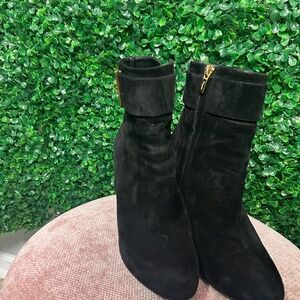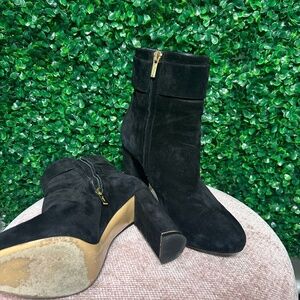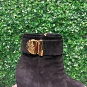 Made in Italy from plush suede and have block heels and rounded toes with gold hardware.