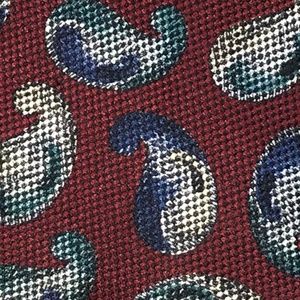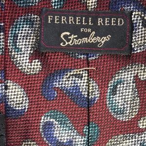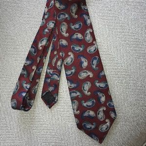 Ferrell Reed 100% Silk Necktie. Printed in Italy, handmade in America. Paisley pattern in deep red and blue. Great pre-owned condition. No known flaws. No stains, snags, or tears. 59” long.