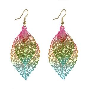 These earrings are so colorful and pretty! Super light weight laser cut leaves with hanging length of approximately 2 1/8" with gold tone French ear wire. J0021