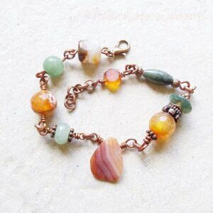 >>> Fits a 7-7.5" wrist - which is the average to slightly larger woman's size wrist. Various semi-precious stones include different types of Agate and Jasper Beads, Aventurine, and a faceted glass bead. Securely closes with a lobster claw clasp.