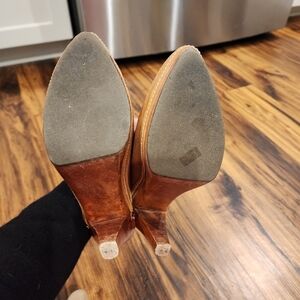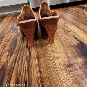 Condition is great! Light, natural distressing to the leather. Slight chip in the wooden heel.