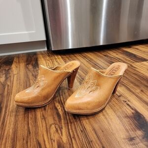 1970's tan honey leather clog with wooden heel