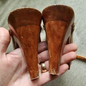 Condition is great! Light, natural distressing to the leather. Slight chip in the wooden heel.