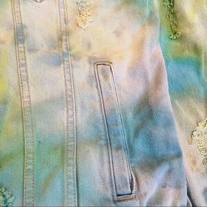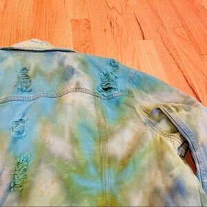 Festival tie dyed jean jacket M distressed ripped blue green ocean water