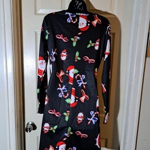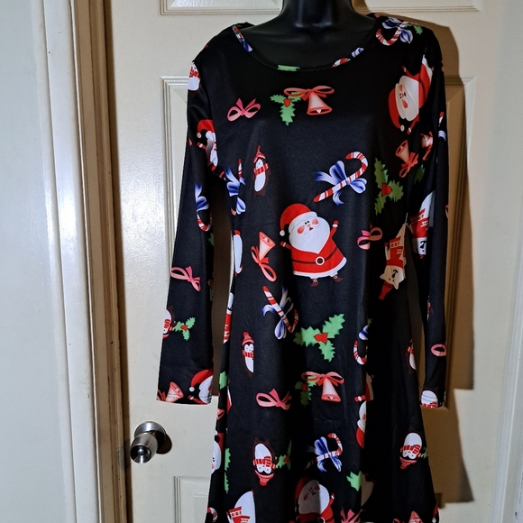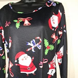 Celebrate the holidays in style with this festive black dress featuring a playful Santa print. Perfect for seasonal gatherings.