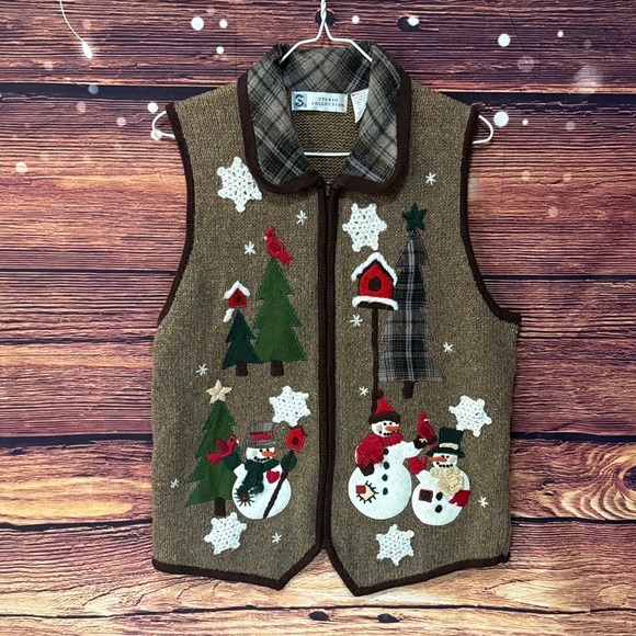 Celebrate the season with this charming brown holiday sweater vest. Featuring playful snowman and tree designs, it's perfect for adding a festive touch to your wardrobe.