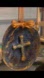 Beautiful handmade ornament crafted on a genuine Capiz shell, featuring an ornate bronze-tone cross centered on a deep navy background with shimmering gold accents. The entire front is resin-coated, giving it a glossy, durable finish that enhances the sparkle and brings out the natural sheen of the shell.