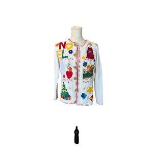 Celebrate the season with this charming white cardigan featuring vibrant embroidery. Perfect for adding a festive touch to your wardrobe. Excellent condition!