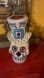 Colorful ceramic sugar skull featuring a top hat with floral and geometric designs. Ideal for festive decor.