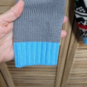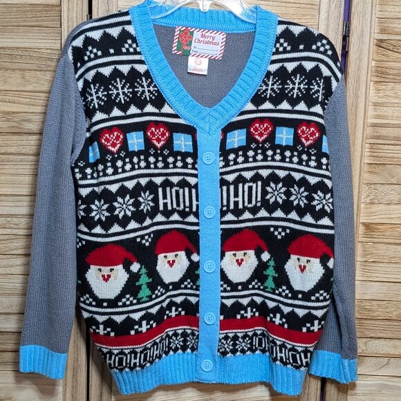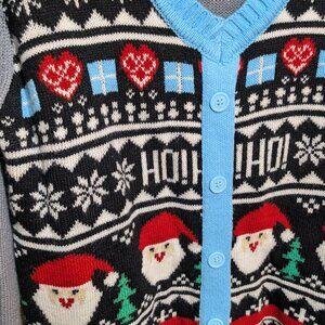 Cozy cardigan featuring Santa, snowflakes, and holiday motifs. Vibrant blue trim adds a pop of color.